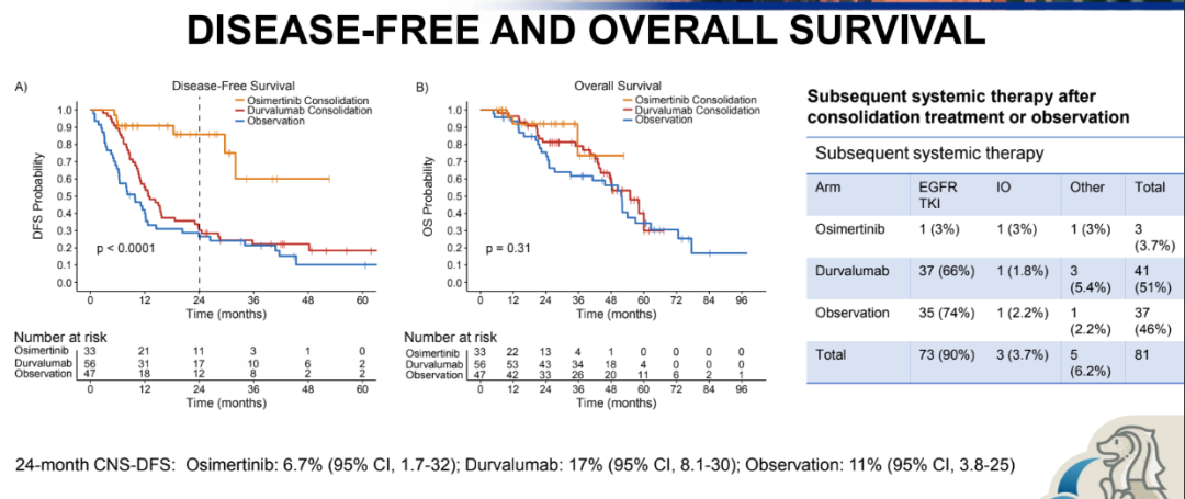 目前,不可切除III期NSCLC患者的标准疗法是同步放化疗(cCRT)序贯度伐利尤单抗巩固治疗。PACIFIC试验的事后分析表明,在EGFR突变型NSCLC患者中,度伐利尤单抗巩固治疗与安慰剂相比缺乏生存获益。目前尚缺乏在放化疗后不可切除的EGFR突变NSCLC患者中比较度伐利尤单抗和EGFR-TKI巩固性治疗的数据。在2023 WCLC发布的这项新研究中,研究人员分析了2015年至2022年期间接受治疗的89例III期EGFR突变NSCLC患者的结局。研究入组要求携带EGFR敏感突变的III期局部晚期不可切除NSCLC患者,若接受≥2个周期铂类同步放化疗后未发生进展,随后接受巩固性EGFR-TKI奥希替尼治疗、度伐利尤单抗治疗或进行观察。主要终点为无疾病生存(DFS)和总生存(OS)。