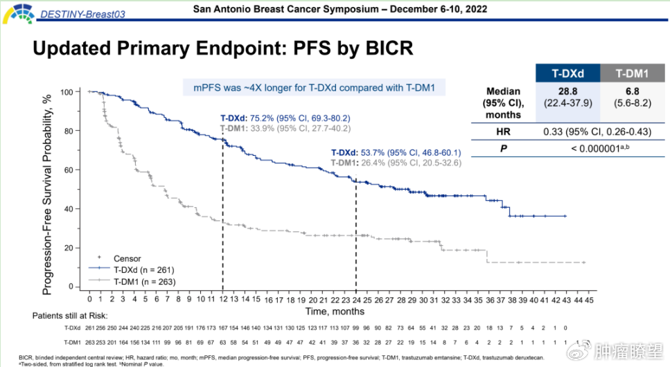 2022年6月6日,ASCO大会公布了DESTINY-Breast04研究的结果,研究结果公布后引起现场一阵欢呼[19];基于DESTINY-Breast04研究结果,随后NCCN指南2022.V4版、ASCO指南对相应内容进行了更新;2022年8月5日,FDA快速批准了T-DXd新的适应症,用于治疗HER2低表达(IHC 1+或IHC 2+/ISH-)不可手术切除或转移的乳腺癌患者,转移患者既往接受过化疗或患者完成辅助治疗6个月内或期间复发[20]。2023年7月11日,NMPA批准T-DXd用于治疗既往在转移性疾病阶段接受过至少一种系统治疗的,或在辅助化疗期间或完成辅助化疗之后6个月内复发的,不可切除或转移性HER2低表达(IHC1+或IHC2+/ISH-)成人乳腺癌患者[21]。DESTINY-Breast04研究结果的公布,改变了当前的临床实践和指南,T-DXd成为了HER2低表达晚期乳腺癌的治疗新标准。