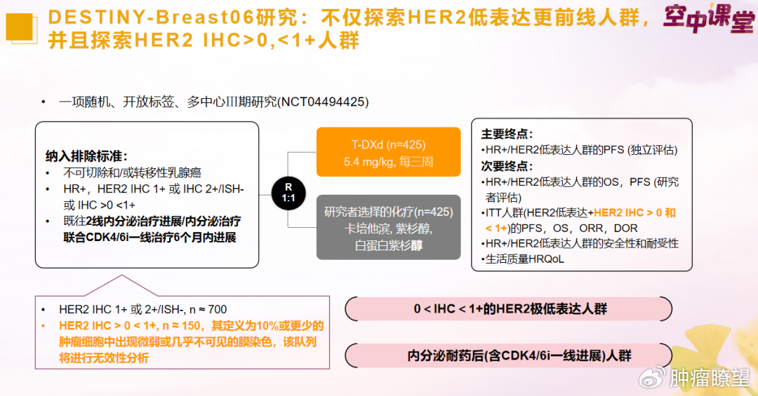 曲妥珠单抗开启了HER2靶向治疗之路,T-DXd开启HER2低表达靶向治疗先河,引领着HER2低表达乳腺癌患者诊疗的变革。但对于HER2低表达和HER2阳性乳腺癌患者如何更好的进行人群筛选和治疗药物的排兵布阵,也是目前我们需要思考的问题。DESTINY-Breast06研究是另一项聚焦于HER2低表达乳腺癌的Ⅲ期试验,但相较于DESTINY-Breast04研究更靠前线,入组患者为经过≥2线内分泌治疗±靶向治疗,且未经化疗的HER2低表达(IHC2+/ISH-,或IHC1+)和HER2超低表达(0<IHC<1+)乳腺癌患者。期待该研究结果的公布能将获益人群拓宽至超低表达人群,并且能为我们带来更多治疗思路。