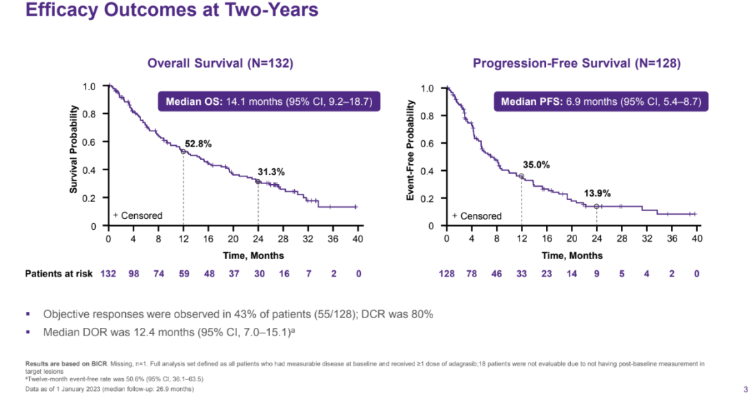 中位随访26.9个月后,I/II期KRYSTAL-1试验显示,患者的中位OS为14.1个月,中位PFS为6.9个月。在43%的患者中观察到客观缓解,疾病控制率为80%,中位缓解持续时间为12.4个月。