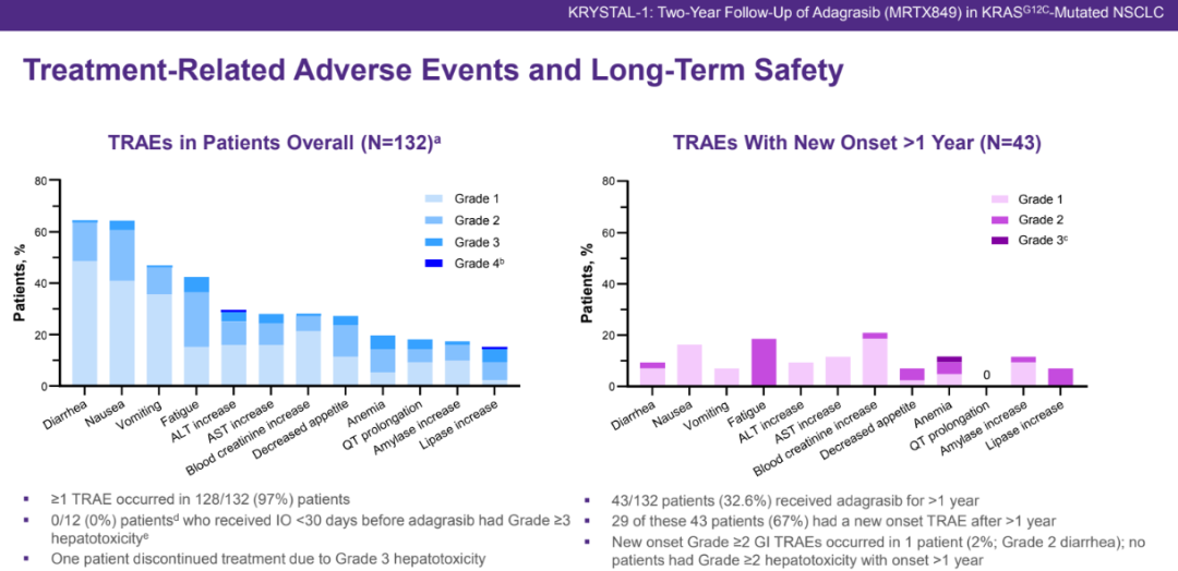 长期治疗没有观察到新的安全信号,并且在第一年治疗后几乎没有新的治疗相关不良事件。最常见的不良事件包括腹泻、恶心/呕吐、疲劳和血清肌酐升高。在Adagrasib开始治疗后30日内接受免疫治疗的患者均未发生≥3级肝毒性,只有1例患者因3级肝毒性停止治疗。