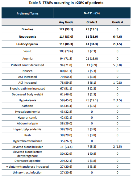 最常见的TEAE为胃肠道和血液学毒性,如腹泻(93.1%)、中性粒细胞减少(87.0%)和白细胞减少(86.3%),但多为1~2级,经支持治疗后缓解或消失。本研究最常见的≥3级TEAE是中性粒细胞减少症(43.5%)和白细胞减少症(32.8%),3级以上腹泻发生率小于20%,整体安全性和耐受性良好。