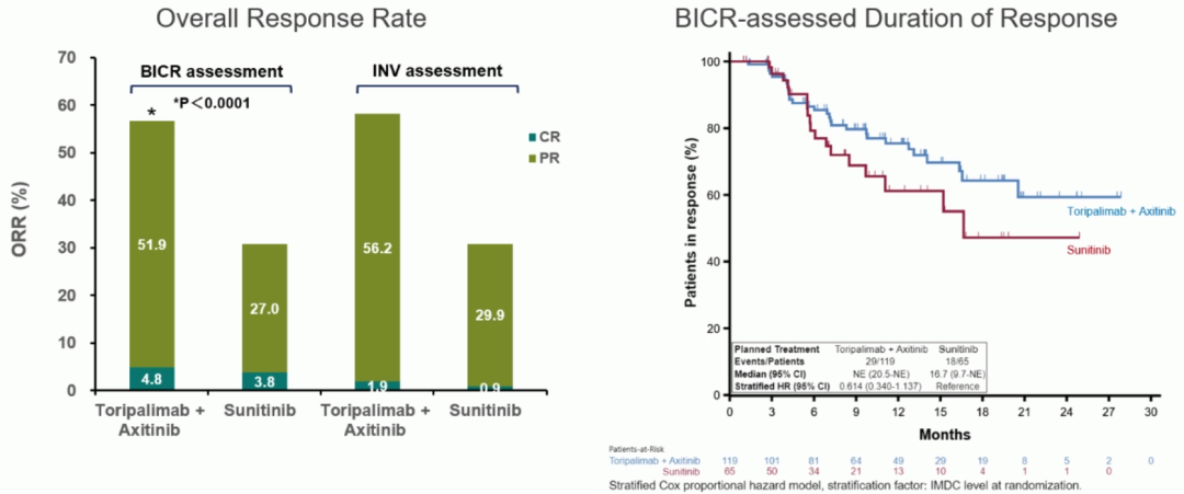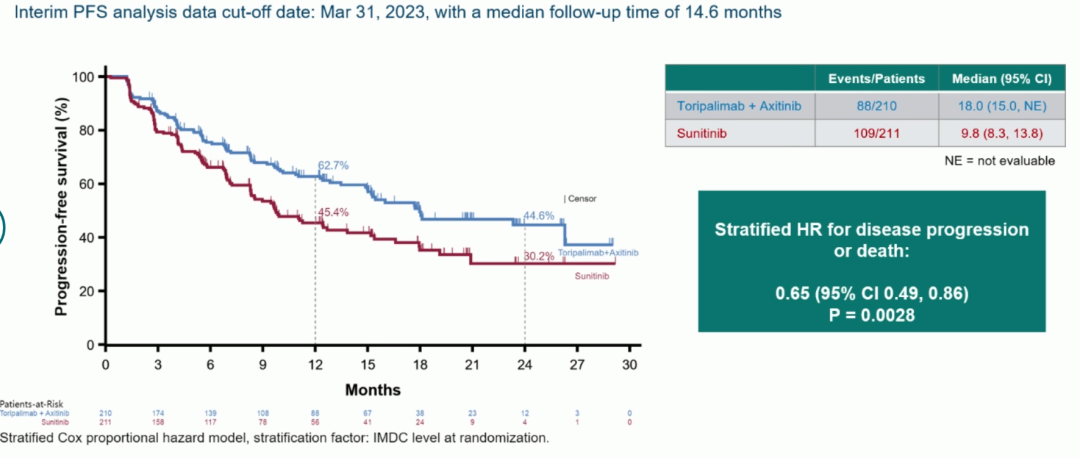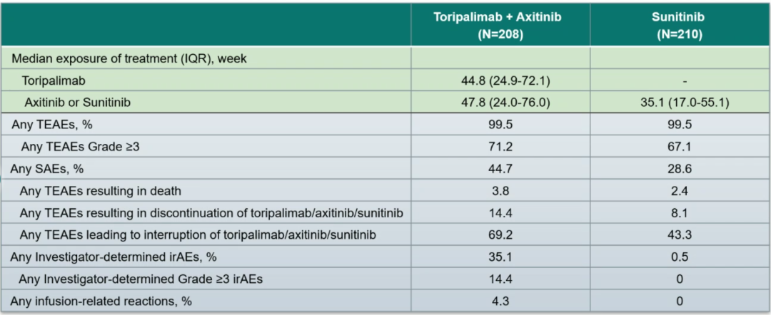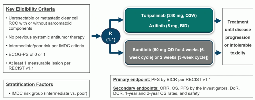 方法:入组患者为未经治疗的不可切除或转移性透明细胞肾细胞癌,根据国际转移性肾细胞癌数据库联盟标准(IMDC)为中危或高危。患者以1:1的比例随机接受特瑞普利单抗(240mg,q3w,iv)联合阿昔替尼(5mg,qd,po),或接受舒尼替尼(50mg,qd,4周[6周/疗程]或2周[3周/疗程])。主要终点是盲法独立中心审查(BICR)根据RECIST评估的无进展生存期(PFS)。