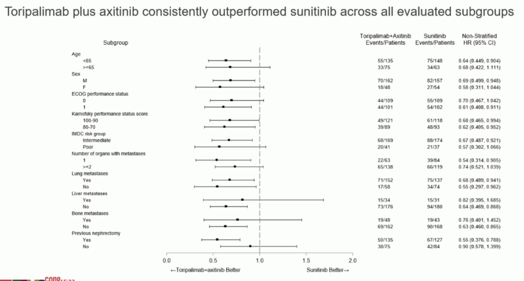 中位随访14.6个月,与舒尼替尼组相比,特瑞普利单抗组的中位PFS显著延长(18.0 vs 9.8个月,HR 0.65,95%CI:0.49~0.86,P=0.0028)。各亚组的PFS获益一致。