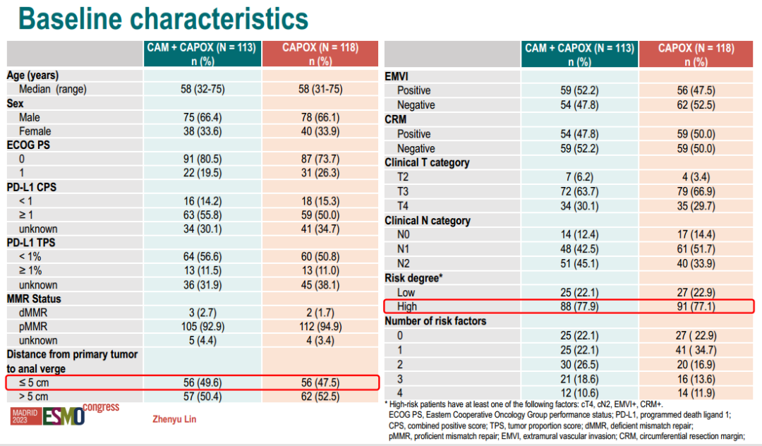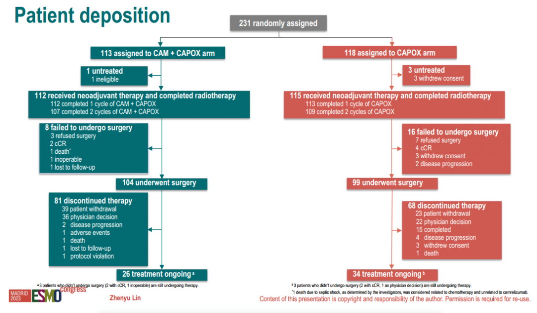 研究共纳入231例患者,113例患者被随机分配到CAM+CAPOX组,118例患者被随机分配到CAPOX组,至数据截止日期2023.07.11,CAM+CAPOX组中112例患者接受了新辅助治疗(107例完成),104例已手术,8例未手术(3例拒绝,2例达到cCR,1例死亡,1例不可切除,1例失访),在接受手术治疗的104例患者中,81例已停止治疗(39例主动要求,36例研究者决定,2例疾病进展,1例因不良事件,1例死亡,1例失访,1例方案违背),26例患者仍在接受治疗;CAPOX组中115例患者接受了新辅助治疗(109例完成),99例已手术,16例患者未手术(7例拒绝,4例达到cCR, 3例撤回同意,2例疾病进展),在接受手术治疗的99例患中,68例患者停止治疗(23例主动要求,22例研究者决定,15例完成治疗,4例疾病进展,3例撤回同意,1例死亡),34例患者仍在接受治疗。