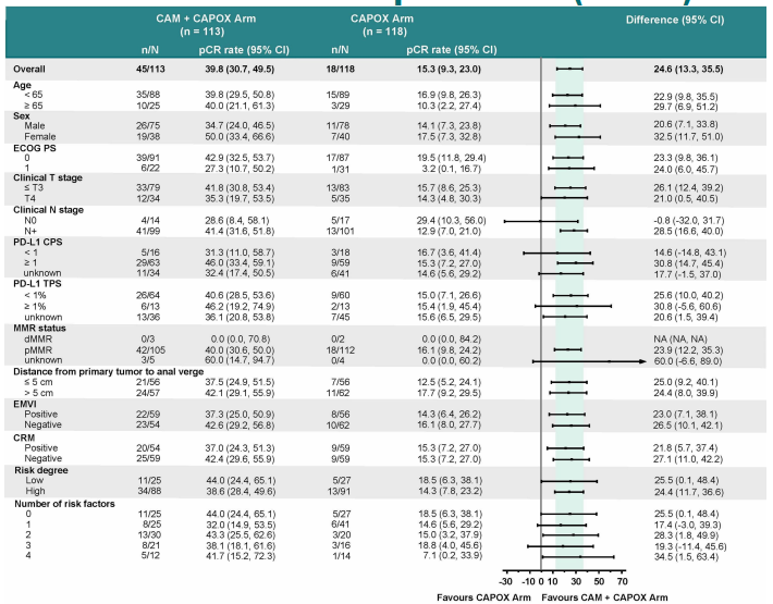 BIRC评估的pCR率(ITT)。CAM+CAPOX组39.8%(95%CI:30.7~49.5)的患者达到pCR,而CAPOX组为15.3% (95%CI:9.3~23.0),两组间的OR(Odds ratio)为3.7(95%CI:2.0~6.9,P<0.001),CAM+CAPOX组的pCR率显著优于CAPOX组,差异具有统计学意义。