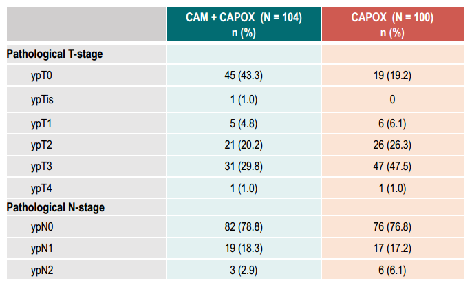 CAM+CAPOX组的45(43.3%)例患者达到ypT0,CAPOX组的19(19.2%)例患者达到ypT0,CAM+CAPOX组患者达到ypT0的比例显著更高。