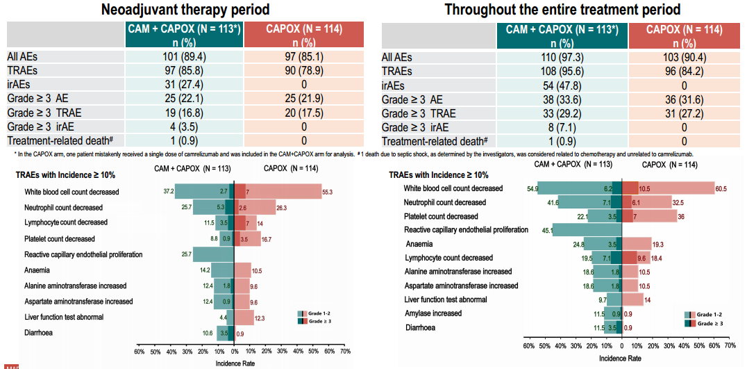 CAM+CAPOX组和CAPOX组的患者出现所有AEs、TRAEs、≥3级AE、≥3级TRAE分别为101(89.4%)例、97(85.8%)例 、25(22.1%)例、19(16.8%)例和97(85.1%)例、90(78.9%)例、25(21.9%)例、20(17.5%)例,两组的并发症发生率未见显著差异。