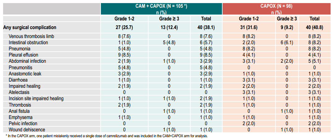 CAM+CAPOX组和CAPOX组的患者出现所有AEs、TRAEs、≥3级AE、≥3级TRAE分别为110(97.3%)例、108(95.6%)例、38(33.6%)例、33(29.2%)例和103(90.4%)例、96(84.2%)例、36 (31.6%)例、31 (27.2%)例,两组的并发症发生率未见显著差异。