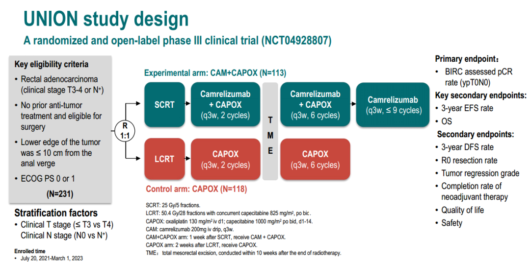 UNION研究招募年龄在18~75岁,组织学证实临床分期为T3-4/N+的直肠腺癌患者,ECOG PS 0或1分,肿瘤下缘距肛缘小于10cm。符合条件的患者按1:1的比例随机分配到CAM+CAPOX组或CAPOX组,并根据临床T分期(≤T3 vs. T4)和N分期(N0 vs. N+)进行分层。患者接受SCRT(25Gy/5f)或LCRT(50.4Gy/28f,同步卡培他滨825 mg/m2,bid)治疗,随后分别接受2个周期的卡瑞利珠单抗(200mg iv drip,d1,q3w)+CAPOX(奥沙利铂130 mg/m2 iv drip d1,卡培他滨1000 mg/m2,bid,d1-14,q3w)或CAPOX,后续进行全直肠系膜切除术(TME)。术后CAM+CAPOX组进行6个周期的卡瑞利珠单抗+CAPOX,和卡瑞利珠单抗单药治疗(总治疗时长不超过一年),CAPOX组进行6个周期的CAPOX。主要终点是病理完全缓解率(pCR)。关键次要终点为3年无事件生存率(3y-EFS)和总生存期(OS),其他次要终点包括R0切除率、新辅助治疗完成率、3年无病生存率、肿瘤退缩分级、安全性和生活质量。根据AJCC第8版标准进行病理评估,并通过盲法独立中心审查。不良事件按照CTCAE 5.0版进行分级。生活质量采用 EORTC QLQ-C30 量表来评估。