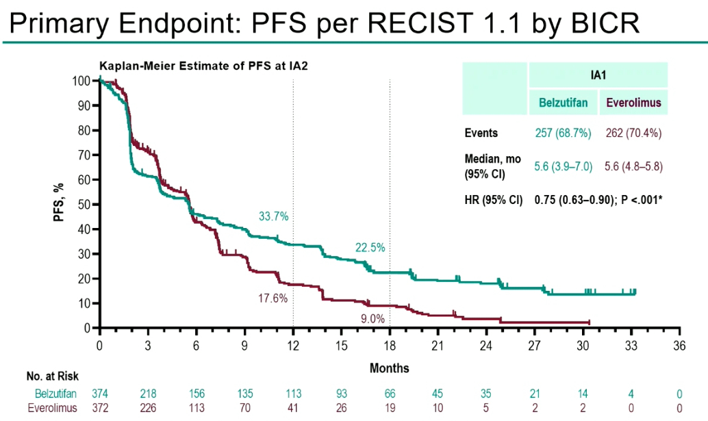 方法:入组年龄≥18岁、KPS≥70%的晚期ccRCC患者,这些患者既往接受过1-3线全身治疗,包括抗PD-(L)1和VEGF-TKI,按照1:1的比例随机分配至Belzutifan组(120 mg QD)或依维莫司组(10 mg QD),治疗直至发生进展或毒性不可耐受。研究设置双主要终点,包括盲法独立中心审查(BICR)的PFS和OS。次要终点包括BICR根据RECIST 1.1评估的ORR(关键)、根据FKSI-DRS评估的安全性和至恶化时间(TTD)。首次中期分析(IA1)时报告了PFS和ORR结果。