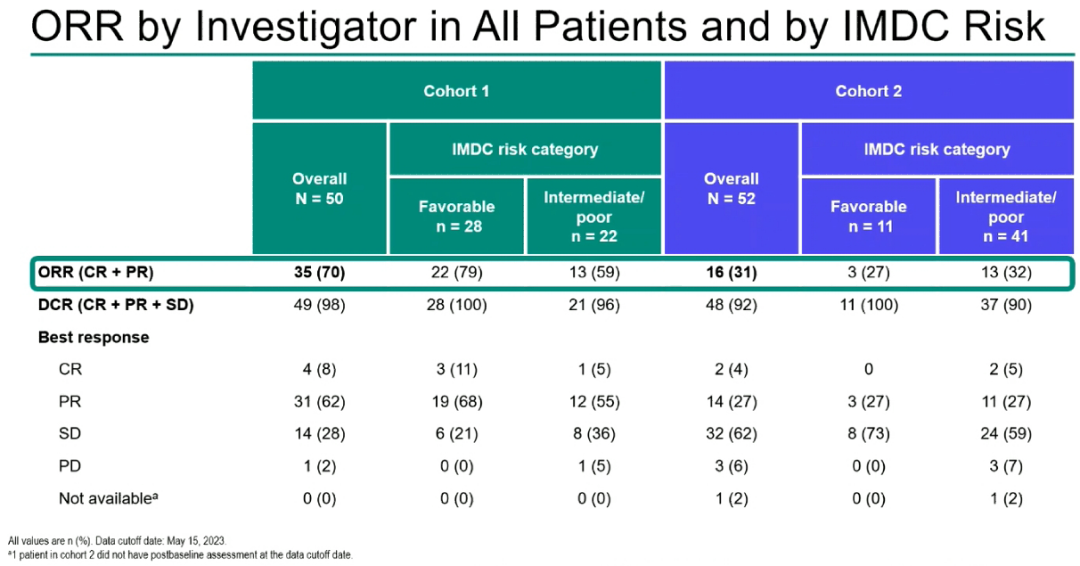 结果:队列1有50例患者,队列2有52例患者。队列1大多数患者(n=28,56%)为IMDC低危,队列2大多数(n=41,79%)为IMDC中/高危。队列1的中位随访时间为24.3个月(范围,4.1-48.2),队列2为39.8个月(范围,33.1-55.0)。队列1总体人群ORR为70%,队列2为31%。队列1中的中位DOR为28.6个月(范围,1.9+至35.8),队列2为31.5个月(范围,4.2+至36.8)。队列1患者的≥24个月持续应答率为57%,队列2为51%。