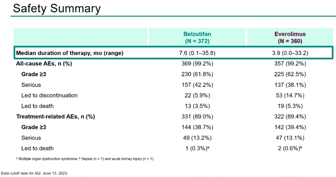 结论:在免疫检查点和抗血管生成治疗后,相比于依维莫司,Belzutifan治疗晚期ccRCC患者的PFS和ORR显著改善。Belzutifan的安全性与既往报告一致,没有新的安全性信号。