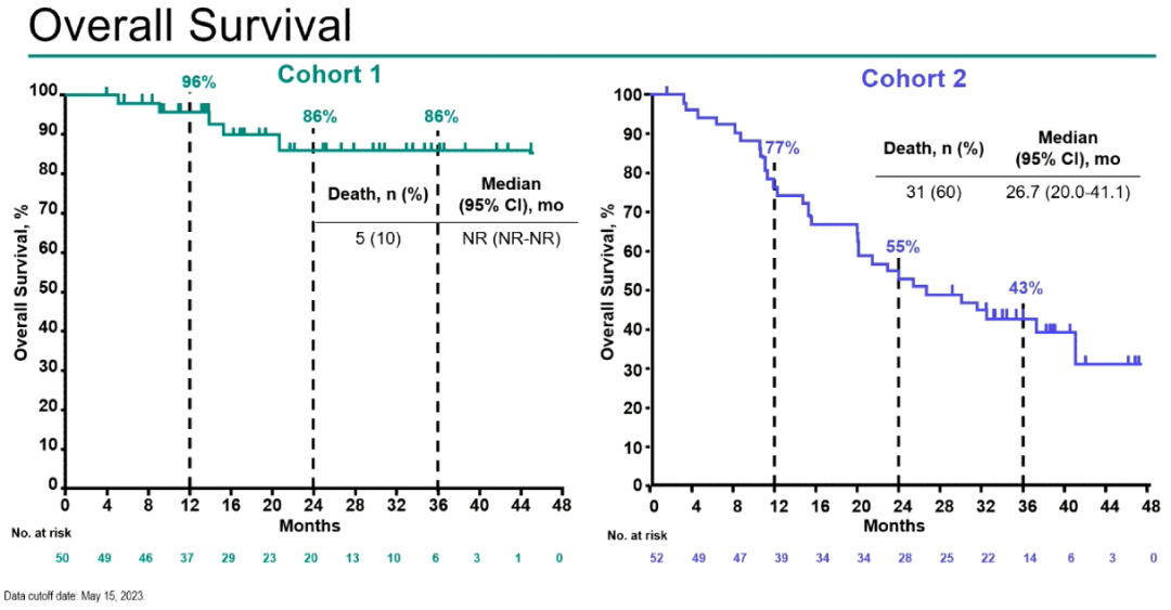 队列1的中位PFS为30.3个月(95%CI,16-NR),队列2为13.8个月(95%CI,9-19)。队列1的中位OS为NR(95%CI,NR-NR),队列2为26.7个月(95%CI,20-41)。