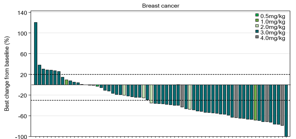 疗效方面,在可评估患者中,所有患者客观缓解率(ORR)为42.9%(95%CI:32.5~53.7),疾病控制率(DCR)为68.1%(95%CI:57.5~77.5),中位缓解持续时间(DoR)为10.97个月。HER2阳性乳腺癌患者ORR为51.9%(95%CI:38.9~64);疾病控制率(DCR)为77.3%(95%CI:65.3~86.7)。按剂量评估的肿瘤缓解见下表(肿瘤缓解)。经过中位随访12个月,乳腺癌患者的中位无进展生存期(mPFS)为6.44个月。