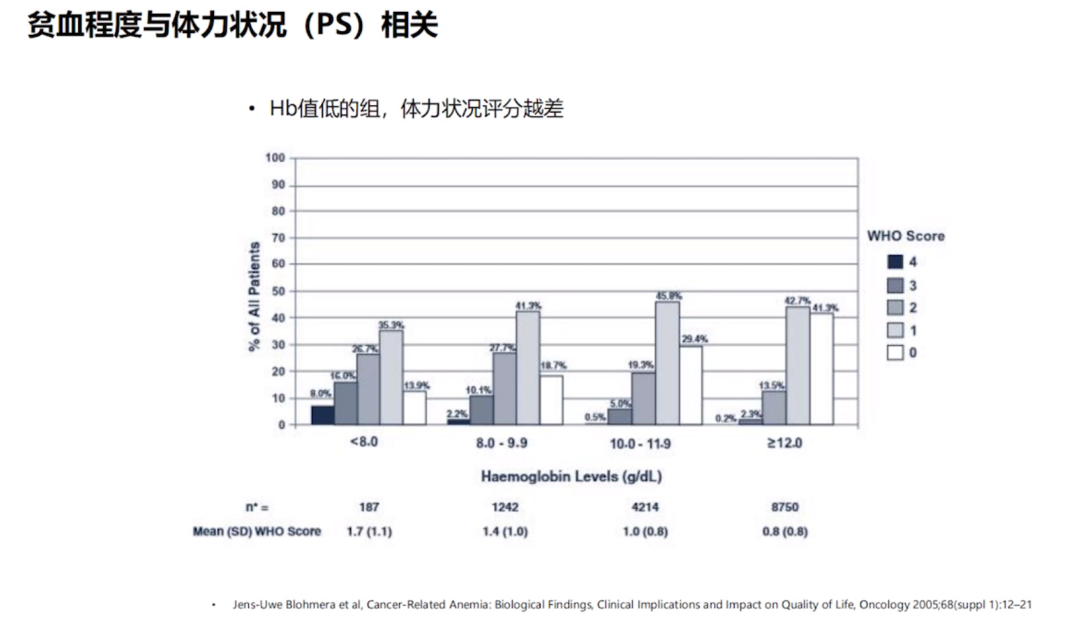 另有研究显示,患者贫血越严重,体力评分(PS)越差。患者Hb≥12g/dL时,41%的患者PS为0,仅约15%的患者PS≥2分;而当Hb<8.0g/L时,仅13.9%的患者PS=0,超过50%的患者PS≥2分,甚至8%的患者PS=4分[15]。