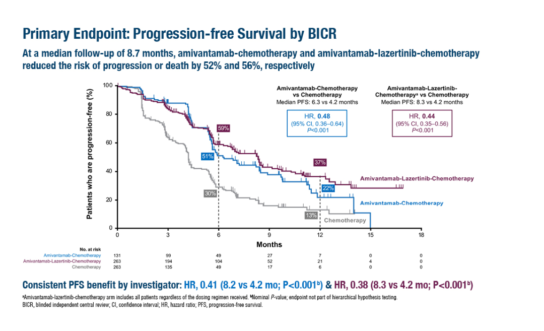 在二线治疗MARIPOSA-2试验中,与单纯化疗(n=263)相比,接受Amivantamab-化疗(n=131;HR=0.48;95% CI: 0.36~0.64;P<0.001)和Amivantamab-拉泽替尼-化疗(n=263; HR=0.44;95% CI: 0.35~0.56;P<0.001)的患者PFS显著改善;Amivantamab-化疗组、Amivantamab-拉泽替尼-化疗组、单纯化疗组的中位PFS分别为6.3个月、8.3个月和4.2个月。