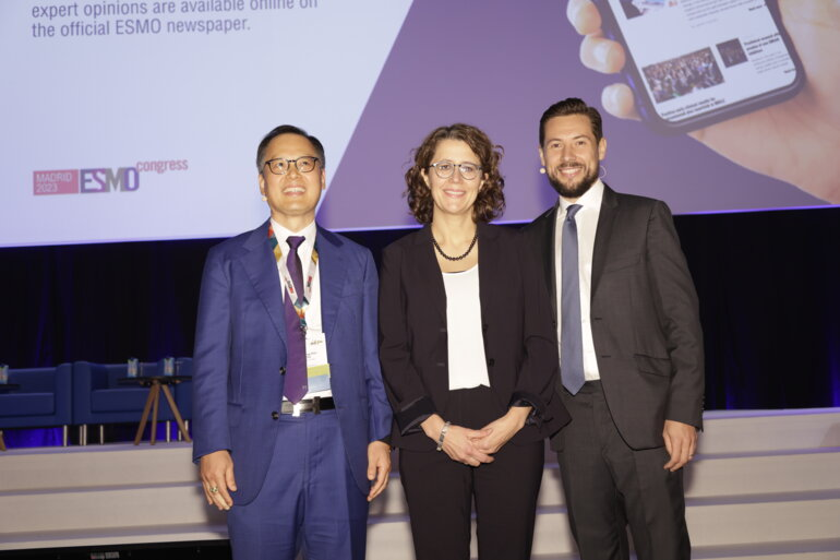 Byoung Chul Cho(韩国)、Zofia Piotrowska(美国波士顿)和 Antonio Passaro(意大利米兰)在 2023 ESMO 第三场主席研讨会上