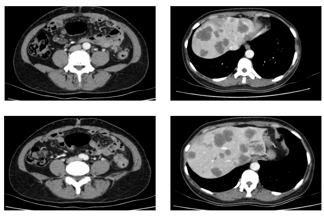 患者为51岁女性,因“间断腹痛半年余,进行性加重1月”于2021年3月就诊于我院结直肠外科。入院时胸全腹部CT(2021-3-29)提示:降结肠远端增厚,肝内多发占位,肺内多发小结节,考虑转移。肠镜检查:在距肛门28公分处,管腔狭窄,内镜不能通过。病理提示:腺癌。