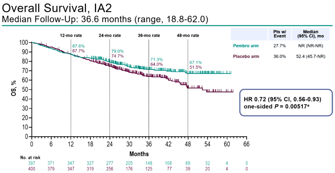 我担任KEYNOTE-671(摘要号LBA56)和CHECKMATE-816研究(摘要号1261O)的点评专家。Jonathan Spicer博士报告了III期KEYNOTE-671研究中围手术期帕博利珠单抗治疗Ⅱ~ⅢB(N2)期非小细胞肺癌的生存数据。这项研究评估了含帕博利珠单抗的围手术期方案,早期可切除NSCLC患者接受以顺铂为基础的化疗联合帕博利珠单抗),然后进行手术,术后接受了1年的帕博利珠单抗治疗,对照组接受安慰剂联合化疗新辅助治疗。帕博利珠单抗组相比安慰剂组显著改善患者OS(中位OS为尚未达到vs 52.4个月;HR=0.72,P=0.00517)。KEYNOTE-671证明了帕博利珠单抗围手术治疗模式带来的OS获益。