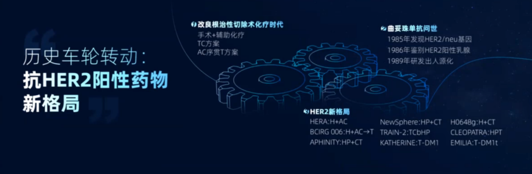 纵观乳腺癌的靶向治疗史,无数历史时刻值得我们铭记。1985年,人表皮生长因子受体2(HER2)基因发现,无意间打开了可能通往治愈的大门。1987年,Robert A.Weinberg教授在《科学》杂志发表了HER2对乳腺癌的意义,这也成为了改变乳腺癌治疗史的重要发现之一。历史的车轮向前转动,科学家发现通过控制HER2基因,可以使乳腺癌患者的生命得到延续。HER2作为治疗靶点被确认后,科学家们开始寻求阻断HER2的方法。经过数年研究,曲妥珠单抗(H)问世,铸就了抗HER2治疗的里程碑事件。