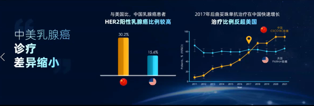 随着乳腺癌的治疗手段日臻丰富,中国乳腺癌的治疗水平也有了大幅度的提升,中美两国乳腺癌患者治疗的差异也在逐渐发生变化。2023年6月30日,《美国医学会杂志》网络开放版(JAMA Network Open,IF=13.8)在线发表了中国临床肿瘤学会(CSCO)乳腺癌数据库协作组的研究报告,该研究利用中国和美国的大型数据库,对2011年至2021年中国与美国早期乳腺癌患者治疗的差距和转变趋势进行了对比。结果显示,中国HER2阳性乳腺癌比例较高,抗HER2精准治疗的比例快速增长,已于2017年反超美国,达到世界先进水平。