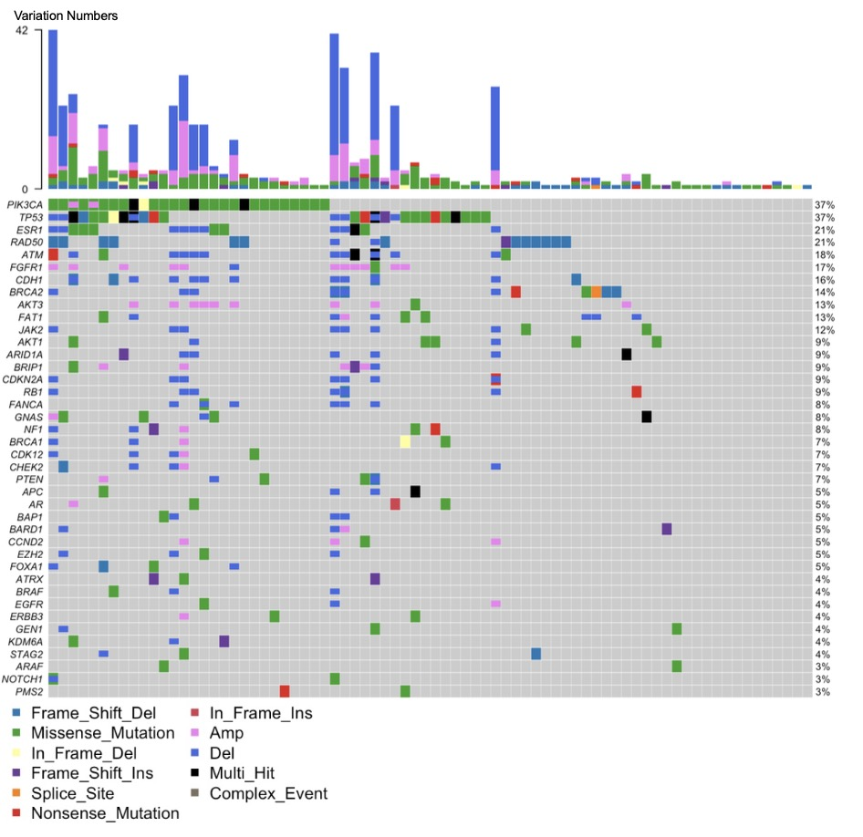 在本研究中,在血浆样本中检测出370个体细胞突变和85个CNV。最常见的改变基因包括TP53(37%)、PIK3CA(37%)、ESR1(21%)、RAD50(21%)、ATM(18%)、FGFR1(17%)、CDH1(16%)和BRCA2(14%)。