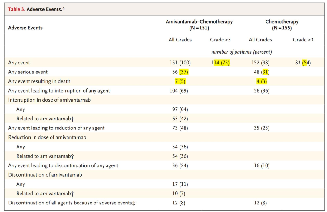 Amivantamab组发生率超过15%的不良反应包括:中性粒细胞下降59%,甲沟炎56%,皮疹54%;在单纯化疗组,分别为贫血55%,中性粒细胞下降45%,恶心42%。两组全因3度以上不良反应发生率分别为75%和54%,严重不良反应发生率分别为37%和31%,并导致5%和3%的患者出现死亡事件。在联合治疗组,分别有69%、48%和24%的患者因不良反应导致治疗中断、剂量降低或永久性给药终止,而在化疗组,这一比例分别为36%、23%和10%。