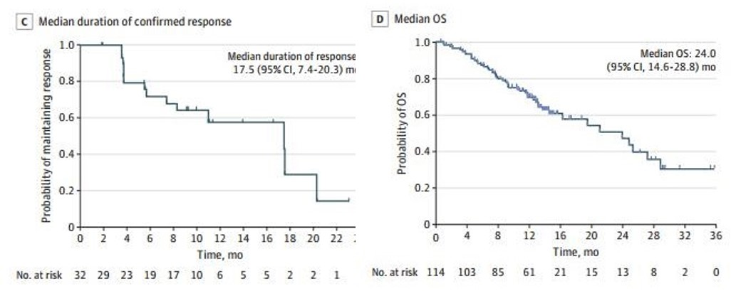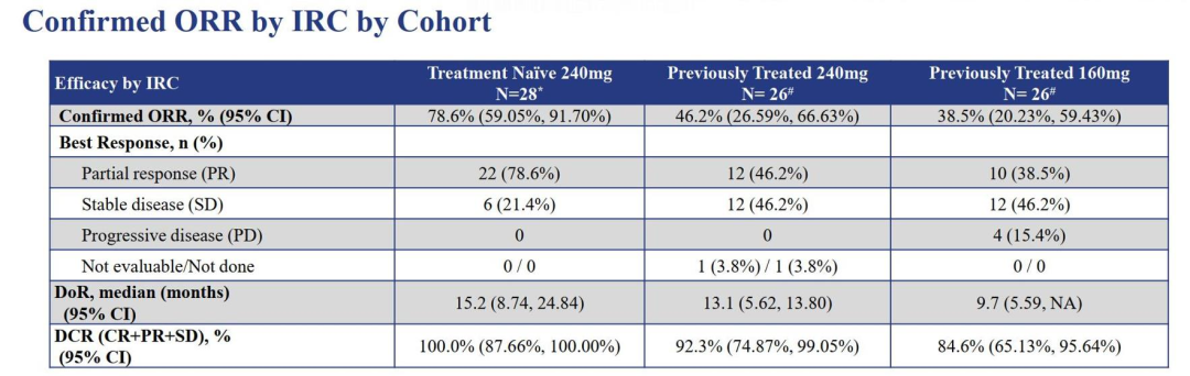 最终,独立审评委员会评估的两组中位PFS分别为11.4个月和6.7个月,HR=0.40,P<0.001,18个月PFS率分别为31%和3%,ORR分别为73%和47%,OR=1.5,P<0.01,中位瘤体缩小程度分别为53%和34%,中位DOR分别为9.7个月和4.4个月,中位响应出现时间分别为6.7周和11.4周。
