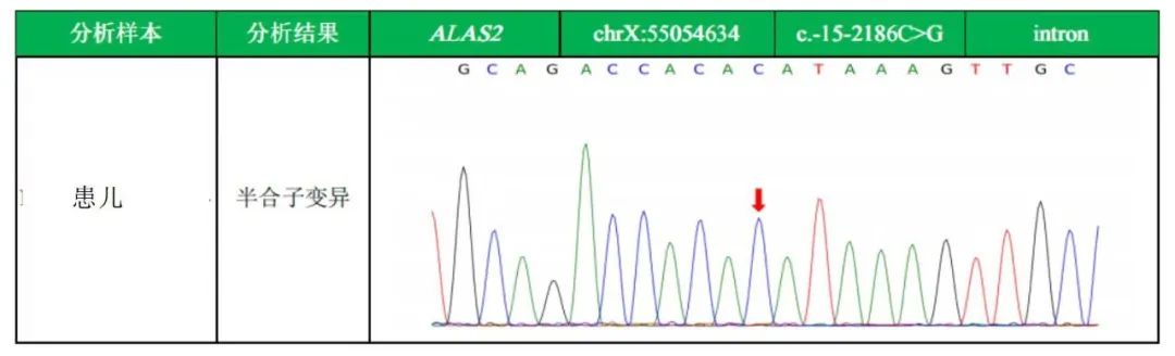 其母基因检测结果:ALAS2基因c.-15-2186C>G位点chrX:55054634存在杂合变异。