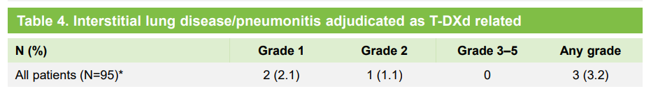 安全性方面,最常见的不良事件为贫血、白细胞减少和中性粒细胞减少,均为临床管理较为成熟且可控的不良事件。确定与T-DXd相关的ILD/肺炎发生率3.2%,均为1-2级。T-DXd的安全性得到确证。