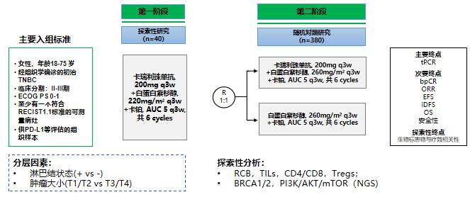 这项两阶段、前瞻性、多中心研究。在第一阶段入组39例既往未经治疗的II-III期TNBC患者。入组受试者接受试验药物进行新辅助治疗,包括6个周期的卡瑞利珠单抗(200mg,q3w),以及白蛋白紫杉醇(220mg/m2,q3w)和卡铂(AUC 5,q3w)。在第二阶段,入组患者以1:1的比例随机分配至卡瑞利珠单抗+白蛋白紫杉醇+卡铂组或白蛋白结紫杉醇+卡铂组。本次大会报道了研究第一阶段的数据。主要终点是总病理学完全缓解率(tpCR,ypT0/is ypN0)。次要终点包括乳腺病理学完全缓解率(bpCR,ypT0/is)、客观缓解率(ORR)、无事件生存期(EFS)和安全性。