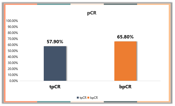 2021年9月至2023年3月期间,第一阶段共入组39例患者。39例中有35例淋巴结阳性,占89.7%,此外,还有1例尚未手术。研究结果显示,ITT人群tpCR率为57.9%(22/38),bpCR率为65.8%(25/38)。新辅助治疗结束时的ORR为87.2%(34/39)。在39例患者中,11例(28.2%)发生≥3级治疗相关不良事件,其中最常见的是血小板计数降低(6例[15.4%])、白细胞计数降低(5例[12.8%])、中性粒细胞计数降低(5例[12.8%])、丙氨酸氨基转移酶升高(2例[5.1%])、天门冬氨酸氨基转移酶升高(1例[2.6%])和甲状腺功能减退(1例[2.6%])。5例(12.8%)患者发生因药物不良反应导致的停药,7例(17.9%)患者发生治疗延迟。4例(10.4%)患者发生了治疗相关的严重不良事件。