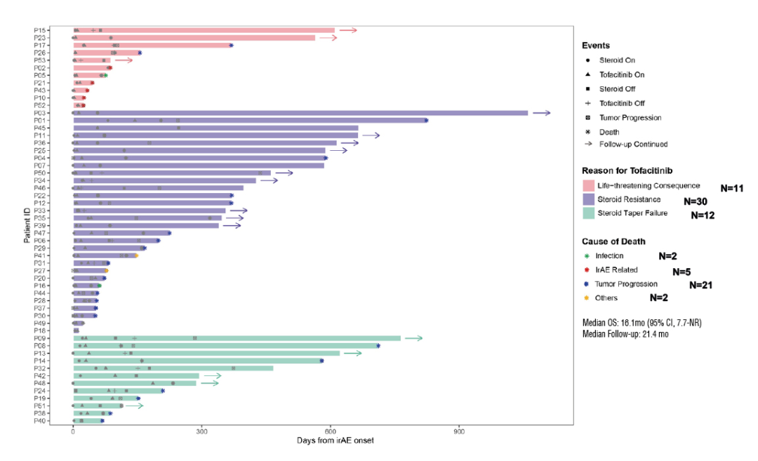 一项研究评估了JAK-STAT抑制剂tofacitinib(托法替尼)用于治疗难治性irAEs(摘要433MO)。研究纳入53例患者,从irAE发生到托法替尼治疗的中位时间为17天(范围2-186),托法替尼治疗的中位持续时间为48.5天(范围3-277)。托法替尼治疗11例危及生命的irAEs的缓解率为54.5%,治疗30例类固醇耐药irAEs的缓解率为96.7%,12例类固醇减量治疗失败患者的缓解率为100%。