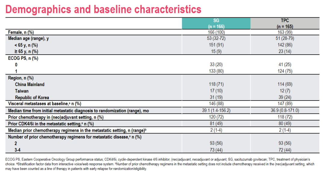 首先,两项研究在入组人群的选择上具有不同之处,TROPiCS-02研究要求入组患者既往一定要接受过内分泌治疗联合CDK4/6i,因为该治疗方案目前是HR+/HER2-晚期乳腺癌治疗的标准治疗推荐。而EVER-132-002研究仅要求晚期阶段接受过内分泌治疗后耐药的患者,不要求一定接受过内分泌联合CDK4/6i,因为在EVER-132-002研究设计伊始,亚太地区的一些国家CDK4/6i的可及性差,只有49%的入组患者接受过CDK4/6i的治疗。此外,EVER-132-002研究入组的患者更为年轻,中位年龄为52岁,而TROPiCS-02研究入组患者中位年龄56岁;在既往治疗线数方面也有差异,EVER-132-002研究和TROPiCS-02研究在晚期阶段的中位化疗线数分别为二线和三线。就结果而言,SG在两项研究中都显示出了其具有统计学意义的PFS改善和OS延长,但PFS和OS的绝对数值具有差异,例如EVER-132-002研究和TROPiCS-02研究SG组的mOS分别是21.0个月和14.5个月,究其原因也与入组人群既往治疗方案的差异有关。在入组人群、样本量和治疗结果方面,两项研究存在一定差距,因此在数值方面,两项研究不能进行头对头的直接对比,但都共同反映了SG治疗人群的获益趋势。