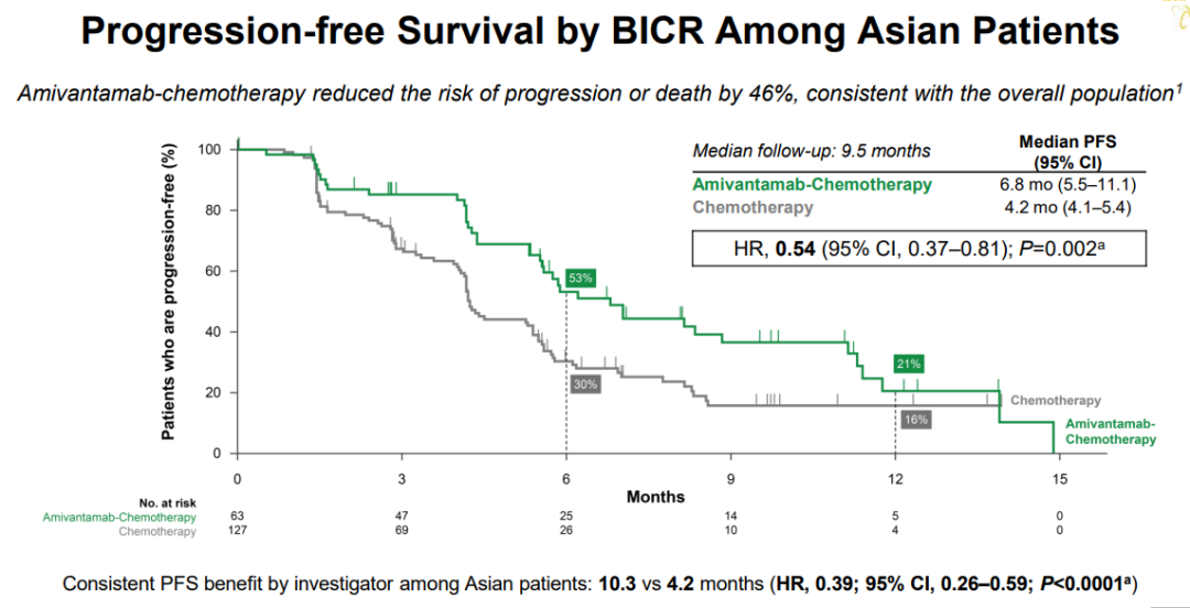 在中位9.5个月随访时,amivantamab联合化疗使疾病进展或死亡风险降低了46%(风险比[HR]=0.54; 95%置信区间(CI): 0.37~0.81;P=0.002),中位PFS为6.8个月,而单纯化疗组的中位PFS为4.2个月。
