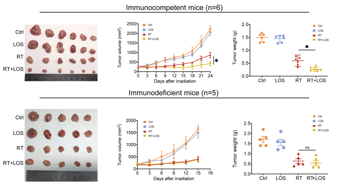 在我们的研究中,发现氯沙坦可以增强免疫活性完整的小鼠模型中TNBC的放射敏感性,但不能增强免疫缺陷小鼠模型中TNBC的放射敏感性(图1)。提示氯沙坦对TNBC的放疗增敏依赖于免疫系统完成。