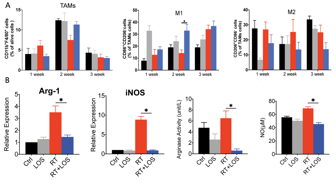 先前的研究已经注意到肿瘤免疫微环境(TIME)在放疗抵抗中起到重要作用。因此,我们在进一步的研究中重点关注肿瘤免疫微环境。对于免疫细胞,我们发现在4T1 TNBC小鼠模型中,氯沙坦促进了TAMs向M1表型的极化,并阻碍了放疗后MDSCs的免疫抑制功能(图2)。