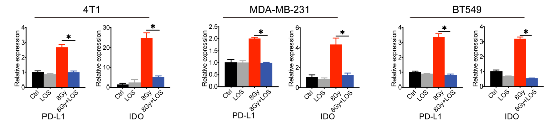 对于免疫因子,我们发现TNBC在暴露于电离辐射之后呈现出程序性死亡配体(PD-L1)和吲哚胺-2,3-双加氧酶(IDO)表达增加,而氯沙坦的加入则可引起PD-L1和IDO表达显著降低(图3)。