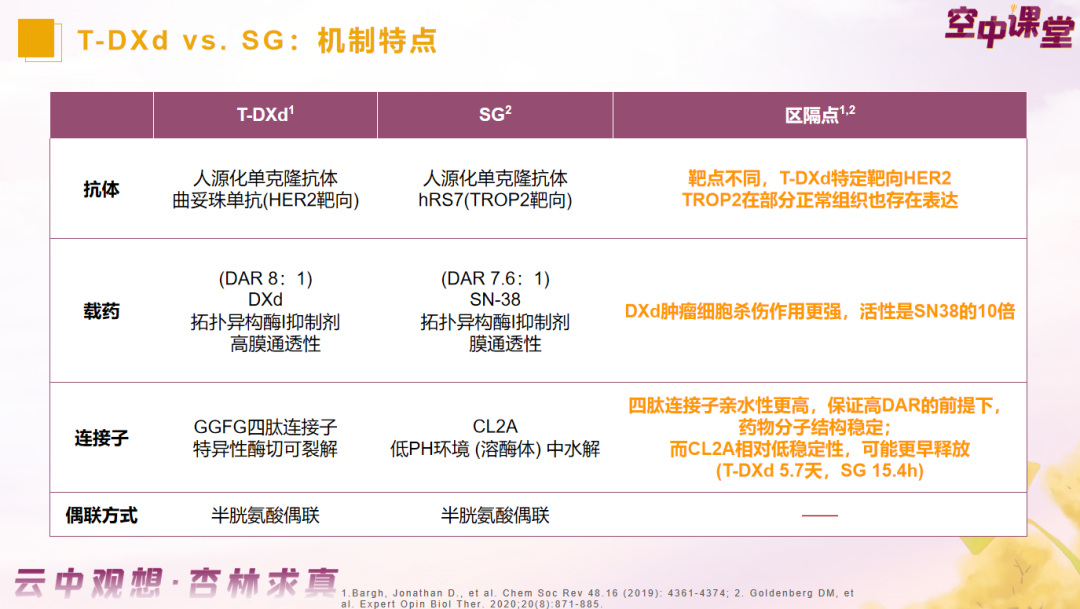 在药物机制方面,T-DXd和SG存在一定差异,包括:(1)抗体的靶点不同,T-DXd特定靶向的HER2往往是乳腺癌的驱动基因,而TROP2在部分正常组织也存在表达。(2)T-DXd的载药DXd具有更强的肿瘤细胞杀伤作用,其活性是SG载药SN-38的10倍。(3)T-DXd的四肽连接子亲水性更高,保证高DAR的前提下,药物分子结构稳定;而CL2A连接子可能更早释放(T-DXd约为5.7天,SG约为15.4小时)[20]