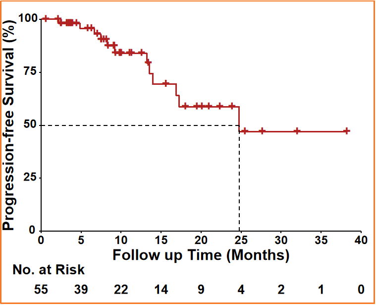在44例患者中观察到客观缓解(完全或部分缓解),ORR为80%,DCR达到100%。中位无进展生存期(mPFS)为24.8个月(95%置信区间[CI]:16.9-NE)。12个月的PFS率为84.0%(95%CI:72.9-96.9),18个月的PFS率为58.8%(95%CI:41.5-83.2)。由于数据不成熟,目前还无法估计OS。