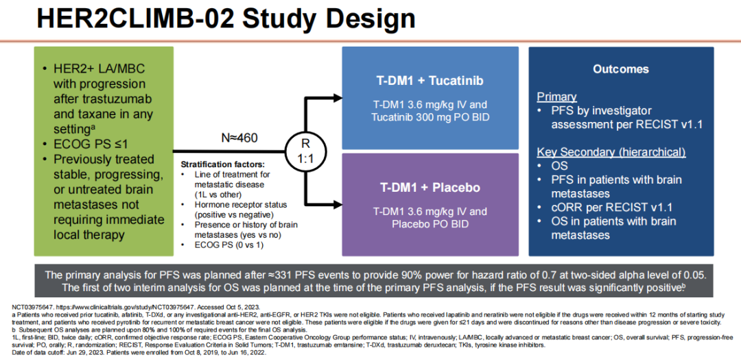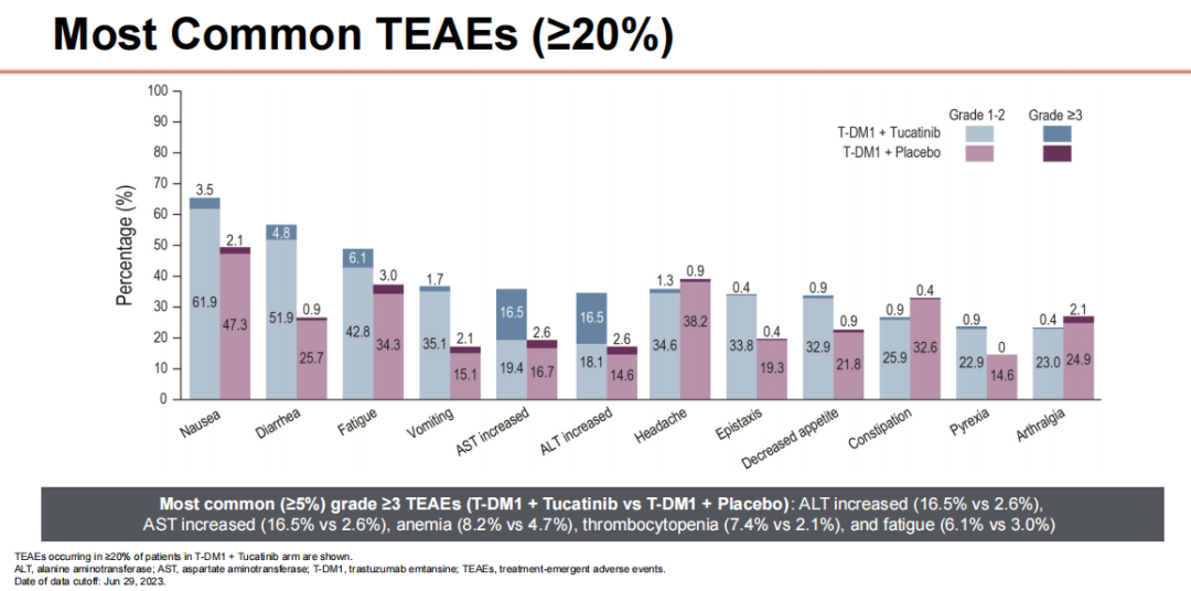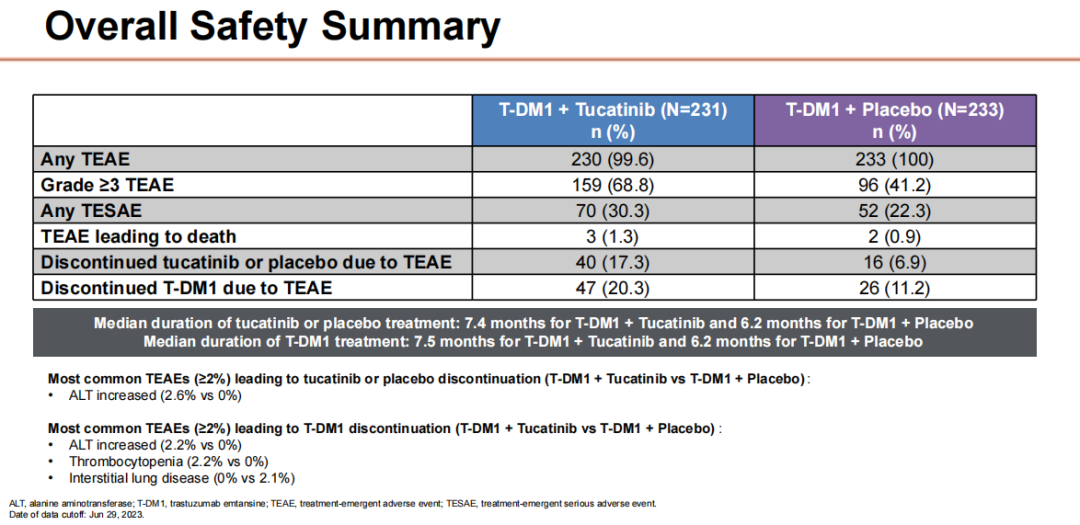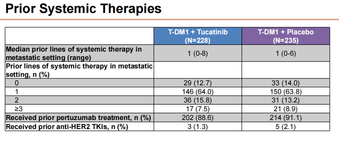 在这项研究中,约一半患者(228例)接受图卡替尼+T-DM1治疗,另一半患者(235例)接受安慰剂+T-DM1治疗。患者既往治疗线的中位数为1,约90%的患者之前接受过帕妥珠单抗治疗。