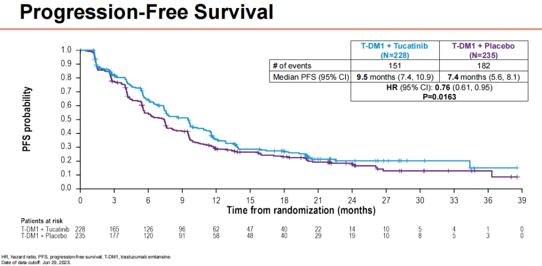 研究结果显示,与安慰剂+T-DM1相比,接受图卡替尼+T-DM1治疗的患者无疾病进展生存期(PFS)显著提高(9.5个月vs 7.4个月,HR 0.76,95%CI:0.61~0.95,P=0.0163)。