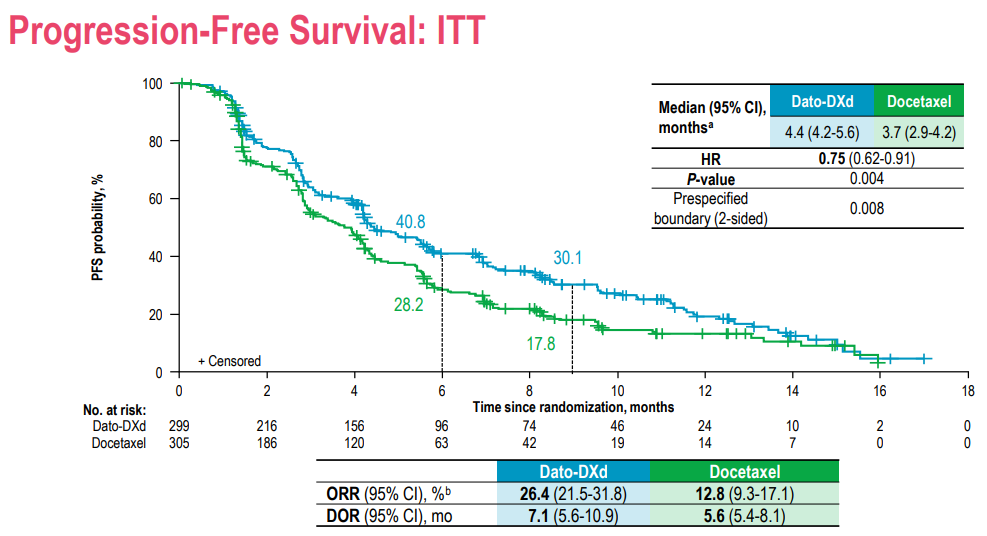 2023 ESMO ASIA会议发布的研究结果(摘要#509MO)显示,在ITT人群中,与多西他赛相比,Dato-DXd单药治疗显著提高了患者的PFS(4.4个月 vs 3.7个月;HR=0.75,95% CI 0.62-0.91,P=0.004),且Dato-DXd组确认的客观缓解率(cORR)较多西他赛组提升了近一倍(26.4% vs 12.8%),两组中位缓解持续时间(DOR)分别为7.1个月和5.6个月。