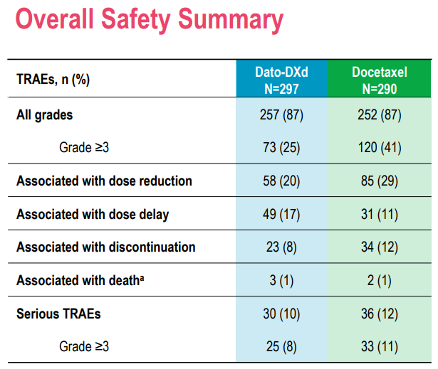 安全性方面,Dato-DXd组患者的≥3级治疗相关不良事件(TRAEs)发生率更低(25% vs 41%)。Dato-DXd相比多西他赛TRAEs导致的剂量降低(19.5% vs 29.3%)和停药(7.7% vs 11.7%)比例更低。Dato-DXd最常见的TRAE为口腔炎(47%)和恶心(34%),且主要为1-2级,中性粒细胞减少和发热性中性粒细胞减少等血液学毒性少见。总体而言,Dato-DXd相对于传统二线化疗获益显著,耐受性良好,安全性可控。