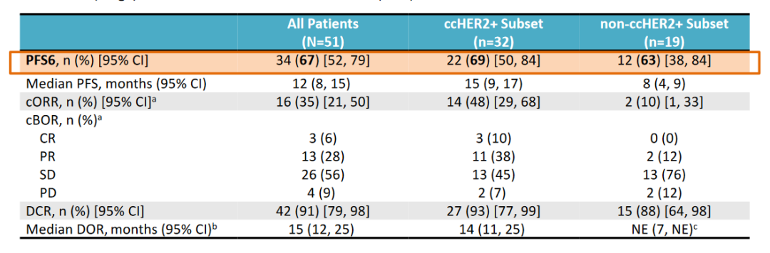 主要终点PFS6为67%(ccHER2+亚组为69%)。mPFS为11.7个月(ccHER2+亚组为14.9个月)。其他疗效终点请参见表1。29例患者(57%)可以获取PAM50亚型分型(1例基底样;16例HER2富集型;12例luminal B)。与HER2富集型相比,luminal B型患者的mPFS(11.7个月vs 9.3个月;P=0.74)和PFS6(66.7%vs 62.5%)在数值上更好,但在统计学上无显著差异。