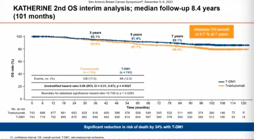 本次大会公布了KATHERINE研究备受关注的OS数据[2],经过8.4年(101个月)的中位随访,T-DM1强化辅助治疗显著改善了新辅助治疗后仍残存侵袭性病灶的HER2阳性早期乳腺癌患者的OS(HR 0.66,95%CI 0.51~0.87,P=0.0027)。T-DM1强化辅助治疗与曲妥珠单抗的7年OS率分别为89.1%和84.4%,相差4.7%。在ITT人群中,在长期随访中,T-DM1的IDFS获益持续存在(HR 0.54,95%CI 0.44~0.66),在关键亚组中也取得一致获益。T-DM1强化辅助治疗与曲妥珠单抗的7年IDFS率分别为80.8%和67.1%,相差13.7%。此外,随着随访时间的延长,没有出现新的安全性问题。两组均罕见心脏毒性。