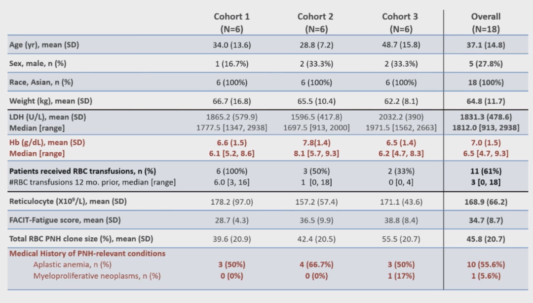 中期分析时,18名患者均完成了24/25周的三个递增剂量的治疗。其中5名男性和13名女性,平均年龄(37.1±14.8)岁,研究前12个月平均需要3次输血,10名患者既往被诊断为再生障碍性贫血。基线平均血红蛋白和LDH水平分别为(7.0±1.5)g/dL、(1831.1±478.6)U/L。