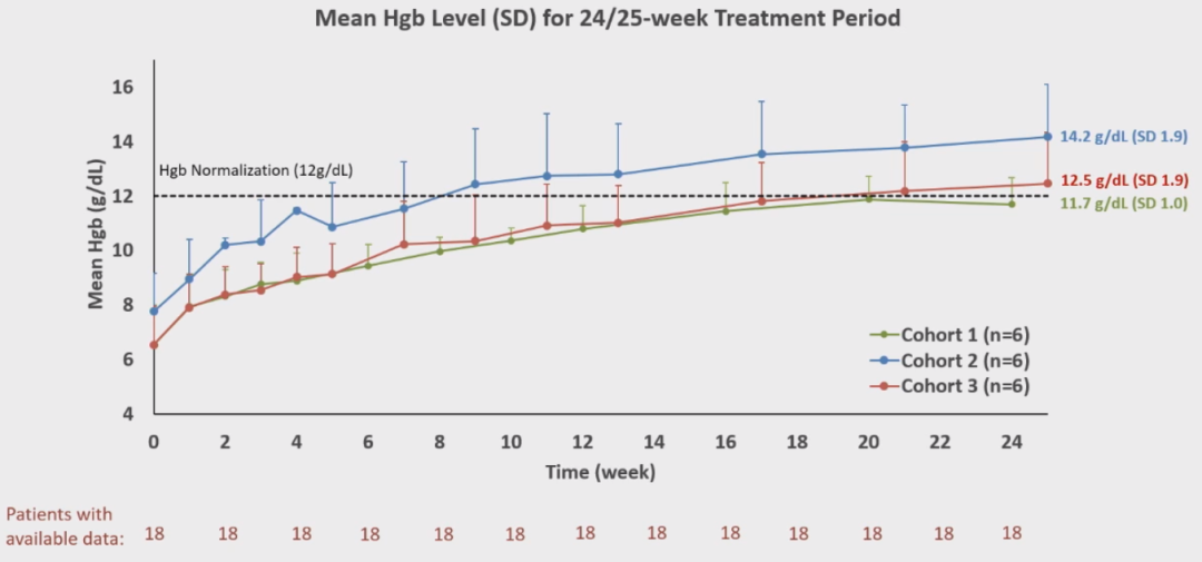 在24/25周治疗期间,患者的血红蛋白水平出现了快速和持续的改善:100%(18/18)患者达到了增加≥2 g/dL的水平(图2),56%(10/18)达到了血红蛋白正常化(≥12 g/dL),而其余的患者接近正常水平;队列1、2和3的血红蛋白平均水平为11.7 g/dL(SD 1.0)、14.2 g/dL(SD 1.9)和12.5 g/dL(SD 1.9)(图3)。