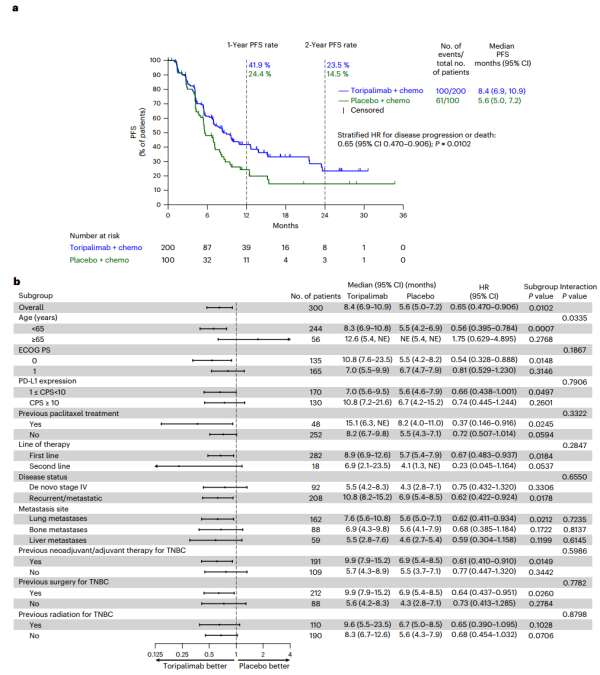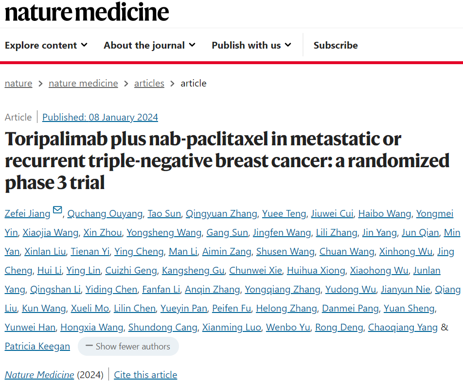 Jiang,Zefei et al.“Toripalimab plus nab-paclitaxel in metastatic or recurrent triple-negative breast cancer:a randomized phase 3 trial.”Nature medicine,10.1038/s41591-023-02677-x.8 Jan.2024,doi:10.1038/s41591-023-02677-x